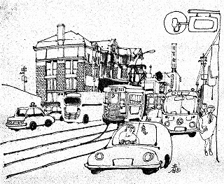 ここの二つの交差点は、福岡市屈指の交通渋滞の場所。電車、バス、マイカー、オートバイ、自転車が、押し合い、へし合い。先を争って交差点を曲がろうとする。そしてその間を縫うように、姪浜や、原方面からリヤカーを引いたおばさんが元気に歩く。