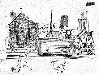 ここから天神に至る舗道は、目下ビル工事などで歩きにくい。頭の上に危険防止の屋根がかぶさったり、小山のようなダンプが、わが物顔で人間様に「そこのけ、そこのけ」。小さくなった通行者は、上を見たり、横を向いたり、天下の大道を歩くのに神経を遣って小さくなって「ンモウ、かなわんな…」