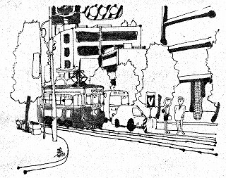 1日。この日が最後の市内電車「長い間、ありがとうございました」の看板を掲げて、全市無料のサービス運転。とにかく65年も続いた市民の足。「ワタシ乗せる人、ボク乗る人…」運転士も乗客も、消えゆく電車に名残を惜しんで、しんみり考え込んだり、妙にはしゃいだり。そして、一夜明けたら、各電停はいっせいに撤去されて、影も形もなくなったところが多かった。